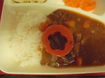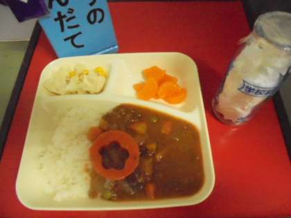 今日の献立は、ハヤシライス、カリフラワーとコーンのピクルス、みかん(缶)、ごはん、牛乳です。ラッキーにんじんが入っていた今日のラッキーさんは、だれかな?