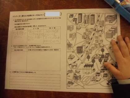 5年生は、「ハンバーガー屋さんの店長になってみよう」の学習をしました。架空の街の地図を見ながら、自分が店長なら、どこに出店する?その理由は?それぞれの良い面と悪い面をグループでシミュレーションをして、まとめます。これからの教育で求められる主体的な学びにチャレンジしました。