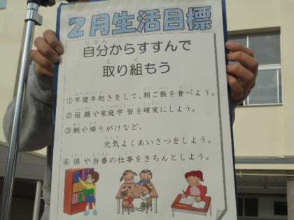 今朝は、2月の生活目標について、司会の小林先生がお話をしてくださいました。「自分からすすんで取り組もう」。何かひとつ小さなめあてを決めて、やってみるといいですね。