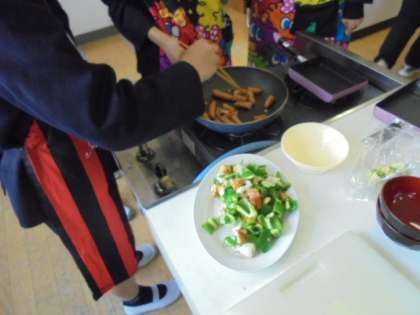 今日は、6年2組が、おべんとうのおかずを作っています。ウインナーとちくわ、ピーマン、卵焼きなどです。家庭科室から、とてもいいにおいがしてきました。明日は、6年1組が実習します。