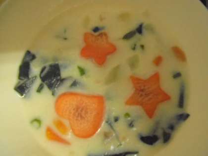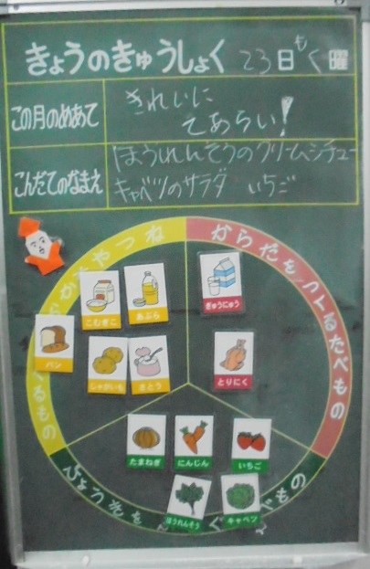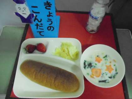 今日の献立は、ほうれん草のクリームシチュー、キャベツのサラダ、いちご、ライ麦パン、牛乳です。給食調理員さんが、シチューに「ラッキーにんじん」を入れてくださいました。今日のラッキーさんは、だれでしょう?