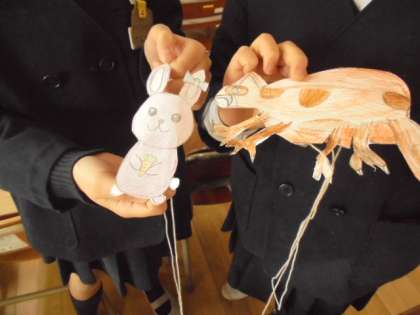 国語の教科書にある絵本「ニャーゴ」を学習しています。1年生と一緒に遊ぶおもちゃも、大人気です。