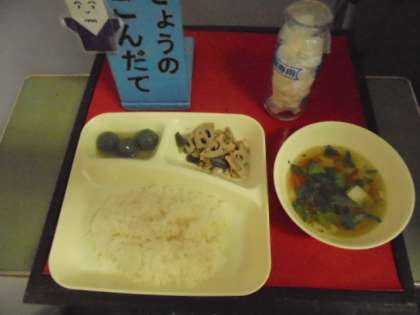 今日の献立は、豚肉とれんこんのいため煮、すまし汁、きな粉よもぎだんご、ごはん、牛乳です。