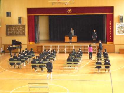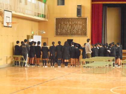 (上)講堂の舞台を使って、卒業証書の受け取り方やよびかけのことばを練習しています。(下)ピアノの周りに集まって、歌の練習です。