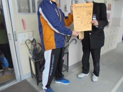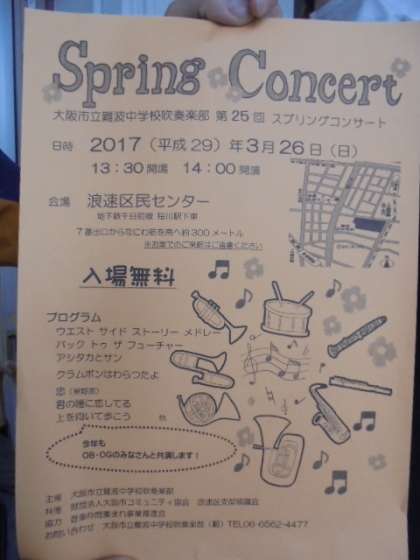 放課後に、難波中学校の生徒たちが、演奏会のチラシを届けてくれました。3月26日(日)浪速区民センターで行われます。がんばってください。ぜひ、応援したいです!