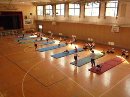 体育館で、マット運動をしています。開脚前転(足を開いた前まわり)や後転(後ろまわり)をがんばっています。