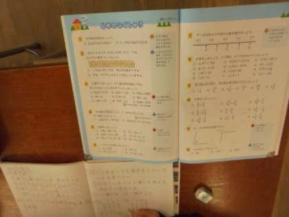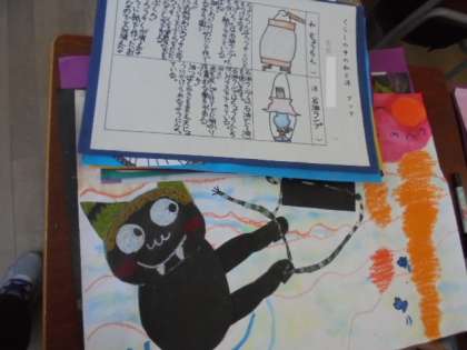 (上)算数の復習問題に取り組んでいます。(下)1年間の作品を子どもたちに返しています。絵本をもとにした上手な絵ですね。