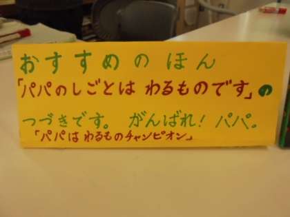 学校図書館補助員の小前先生が、「パパのしごとは わるものです」の続編を紹介してくださっています。何と、パパがチャンピオンになりました。がんばれ、パパ!