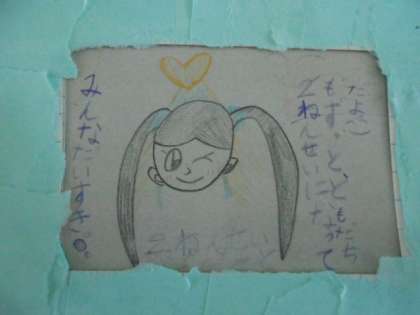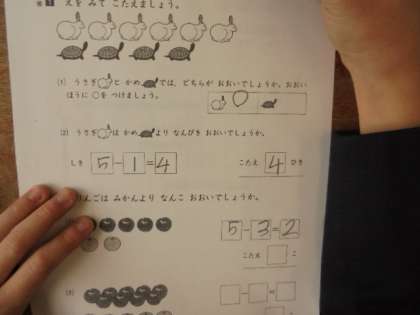 (上)算数のプリントをがんばっています。(下)子どもが書いたメッセージです。「みんなだいすき 2ねんせいになっても ずっとともだちだよ」1年生の先生方は、本当に素晴らしい学級を作ってくださっています。