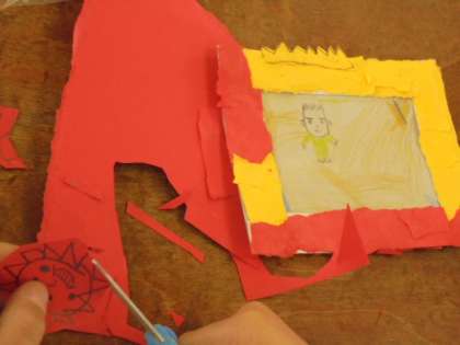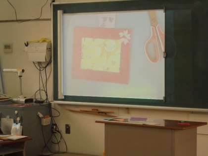 手作りの写真フレームを作っています。担任の先生が書画カメラで説明し、子どもたちは思い思いの作品を仕上げています。