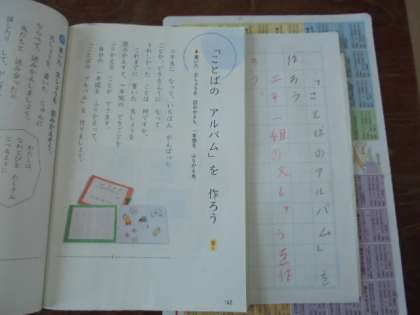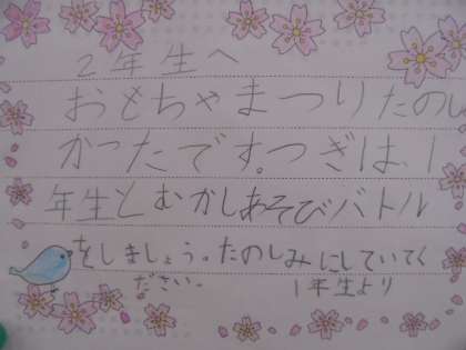 国語科の教科書「ことばのアルバム」をつ作ろうの学習をしています。教室の後ろには、1年生から2年生へおもちゃまつりのお礼と今度は、昔遊びバトルのお誘いです。