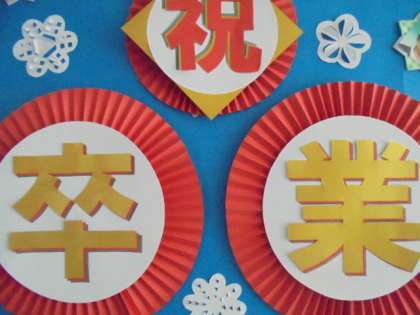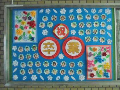 玄関に、卒業を祝いするメッセージと6年生44人全員の写真が掲示されています。子どもたちの表情が素晴らしいです。