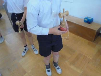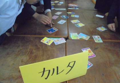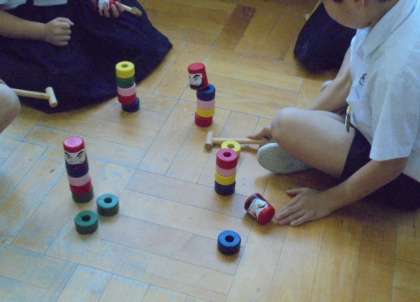 1年生と2年生が、一緒に遊んでいます。だるまおとしやかるた、けんだまなど昔からの遊びで楽しんでいます。