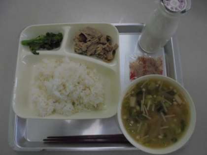 今日の献立は、豚肉のだまだれ焼き、みそ汁、菜の花のおひたし、ごはん、牛乳です。