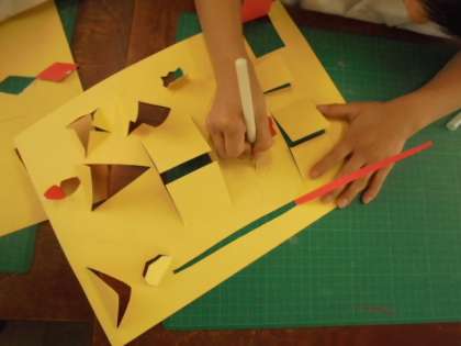 図画工作科で、色紙を切り取って、窓を作る練習をしています。