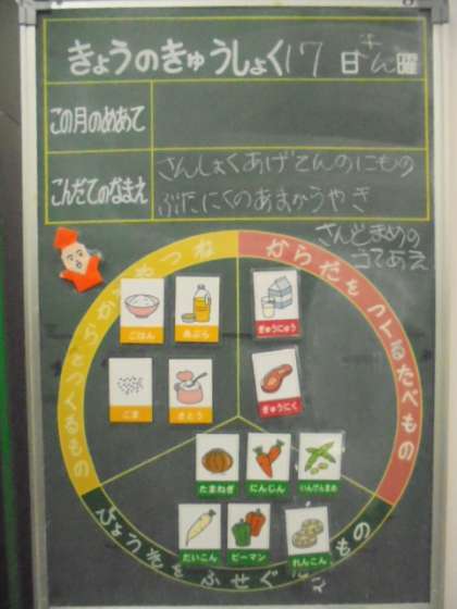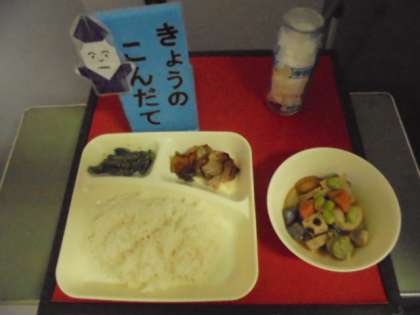 今日の献立は、豚肉の甘辛焼き、三色あげ天と野菜の煮もの、三度豆のごまあえ、ごはん、牛乳です。