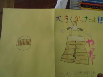 (上・中)「大きくなったよ!」と題して、自分の成長記録を作りました。できるようになったことが、たくさんありますね。(下)作品袋を持ち帰ります。