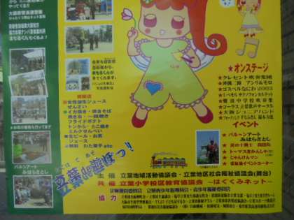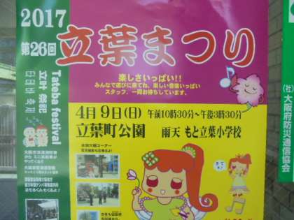 毎年恒例の立葉まつりのポスターが届きました。今年は、4月9日(日)に行われます。時間は、10:30〜15:30。場所は、立葉町公園(雨天時は、もと立葉小学校)です。たくさんの楽しいイベントやオンステージ、模擬店があります。ぜひ、ご参加ください。