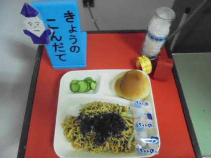 今日の献立は、焼きそば、きゅうりのしょうがづけ、パン、牛乳です。