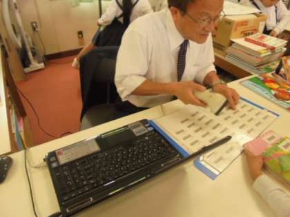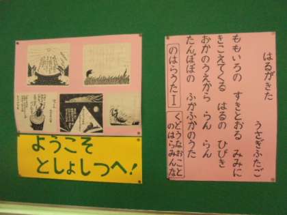 2年生が、図書室で静かに本を読んでいます。本の貸し借りは、図書館補助員の小前恭則先生が手伝ってくださっています。くどうなおこさんの「のはらうた」を張り出してくださっています。