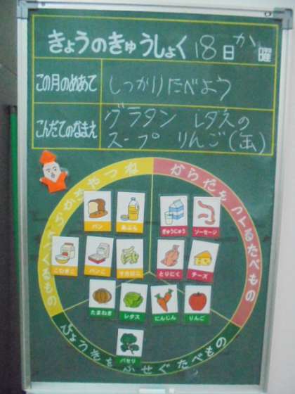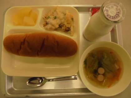 今日の献立は、マカロニグラタン、レタスのスープ、りんご(缶)、パン、牛乳です。