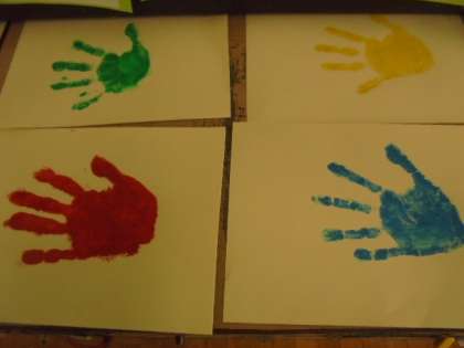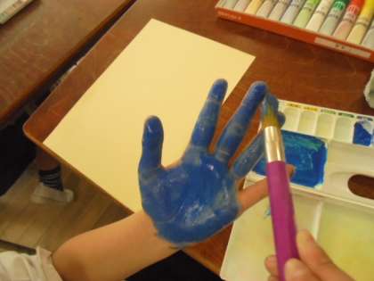 子どもたちの手形をとって、学級目標の掲示に使います。