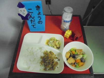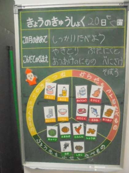 今日の献立は、焼きとり、豚肉とあつあげの煮もの、紅ざけそぼろ、ごはん、牛乳です。