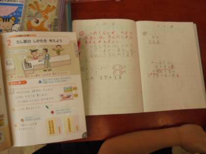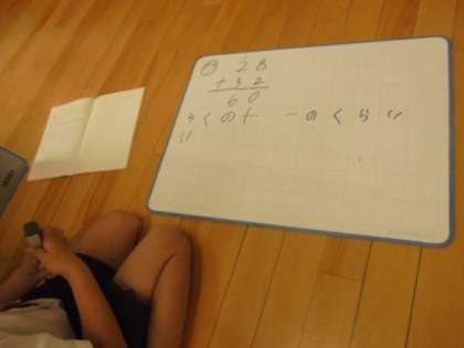 算数で、たし算のひっさんを学習しています。自分の考えをホワイトボードに書いて、友だちに説明しています。