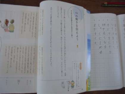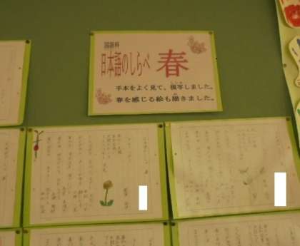 教室の後ろに、春にちなんだ掲示をしています。国語の教科書では、「心の動きを伝えよう」を学習しています。