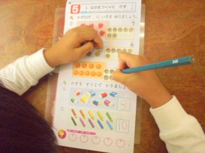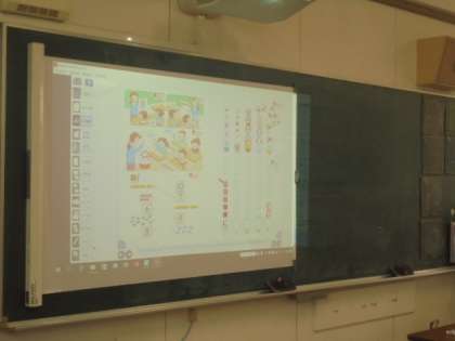 さんすうのべんきょうをがんばっています。先生が、デジタル教科書を使って、説明をしています。