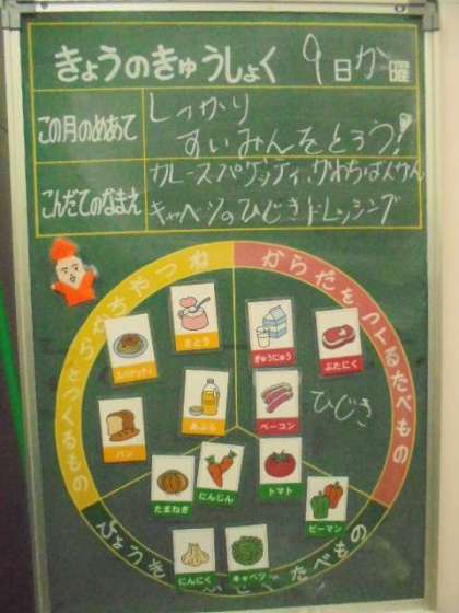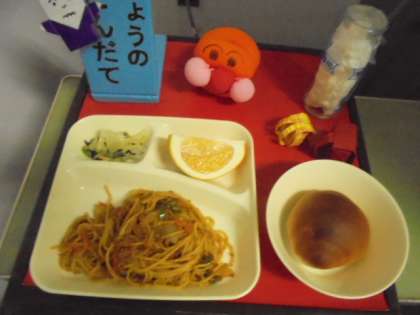 今日の献立は、カレースパゲッティ、キャベツのひじきドレッシング、河内ばんかん、パン、牛乳です。