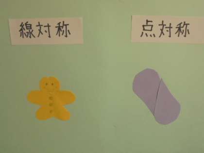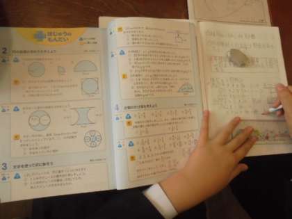 (上)線対称と点対称のデザイン。とても上手です。(下)算数のほじゅうもんだい。6年生になると、問題が難しくなりますね。