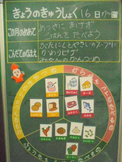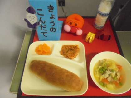 今日の献立は、豚肉と野菜のスープ煮、変わりピザ、みかん(缶)、パン、牛乳です。