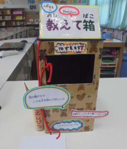 ボランティアの皆さんが、図書室に「教えて箱」を作ってくださいました。「こんな本を読んでほしいな」「図書室にこんな本を置いてほしいな」・・・。素敵な箱をありがとございます。