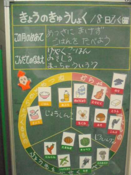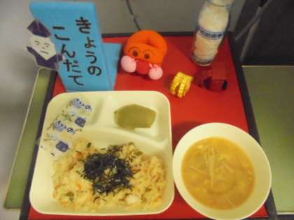 今日の献立は、かやくごはん、みそ汁、まっ茶ういろう、ごはん、牛乳です。ういろうは、給食調理員さんの手作り。かやくごはんも、給食調理員さんが、まぜでくださっています。ありがとうございます。