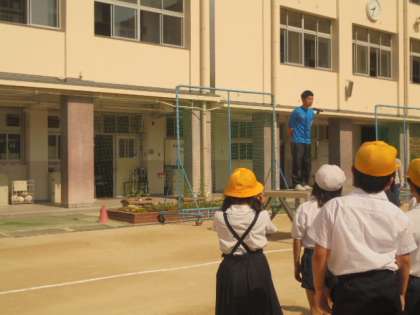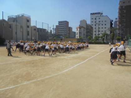 (上)姿勢体操をして、体をほぐしています。(下)今日から、かけ足タイムです。体育主任の梶原先生が、かけ足タイムの説明をしています。