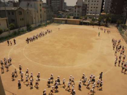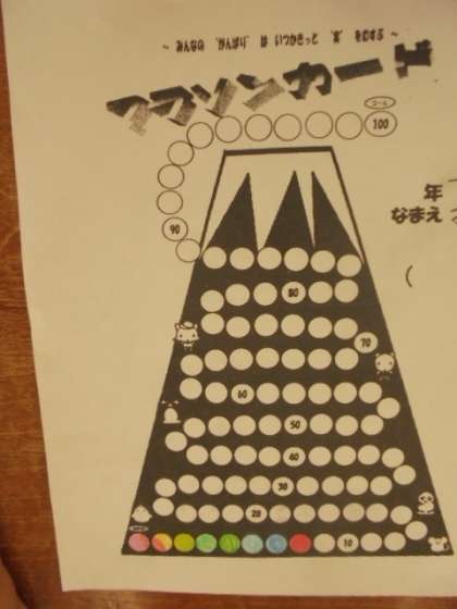 (上)かけ足をしたら、マラソンカードに色を塗ります。山の頂上をめざそう!(下)3時限目後の休み時間、2,4、6年生ががんばっているところです。