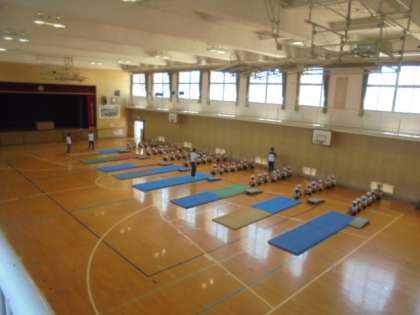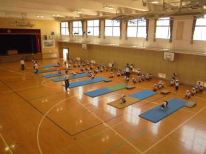 体育館で、マット運動です。先生の説明と模範のあと、各グループで練習しています。