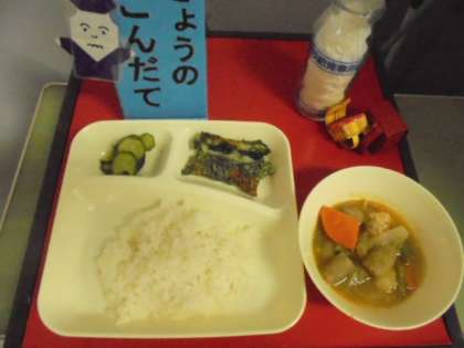 今日の献立は、ちくわのいそべあげ、鶏肉とさといもの煮もの、あっさりきゅうり、ごはん、牛乳です。