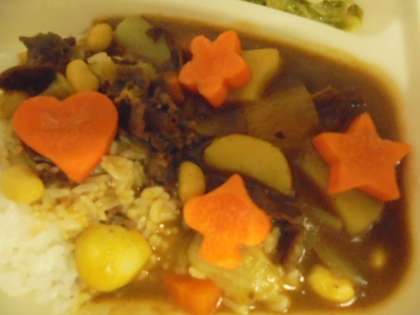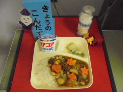 今日の献立は、牛肉と大豆のカレーライス、レタスのサラダ、ヨーグルト、ごはん、牛乳です。給食調理員さんが、ハートやスター、さまざまなにんじんを用意してくださっています。今日のラッキーさんは、だれかな?