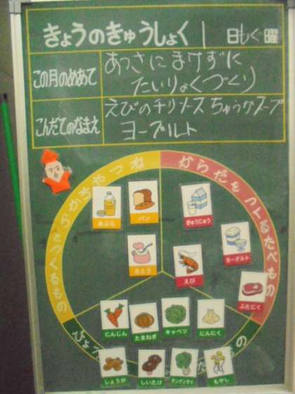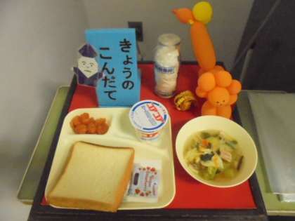今日の献立は、えびのチリソース、中華スープ、ヨーグルト、パン、牛乳です。