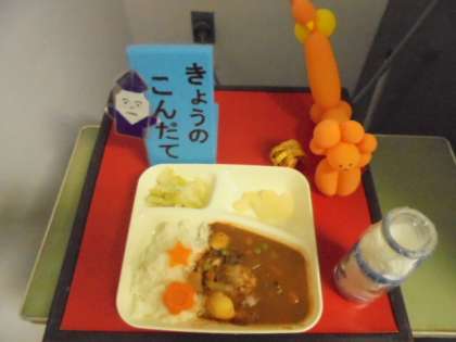 今日の献立は、ハヤシライス、キャベツのゆずドレッシング、和なし(缶)、ごはん、牛乳です。ハヤシライスのルゥは、既成のものを使わず、小麦粉を炒めるところからはじまって、すべいて手作りの逸品です。ラッキー人参も、給食調理員さんのうれしい心遣いです。