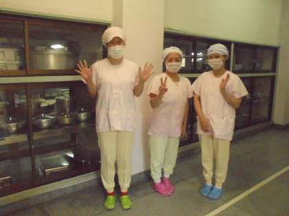 安全で、おいしい給食を作ってくださっている給食調理員さんです。いつもありがとうございます。写真左から、野村さん、山本さん、水元さんです。