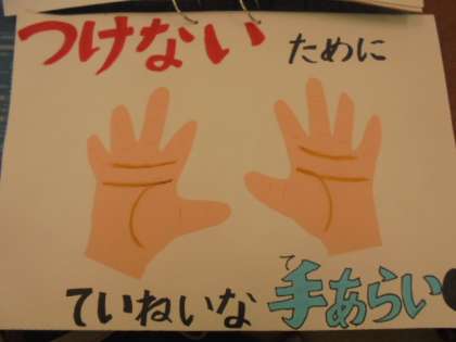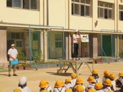 今朝の全校朝会では、司会の岩下先生から、歯みがきや生活目標についてお話がありました。続いて、給食主任の鎌田先生から、食中毒についてわかりやすくまとめた紙芝居をよんでいただきました。