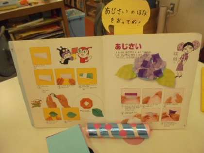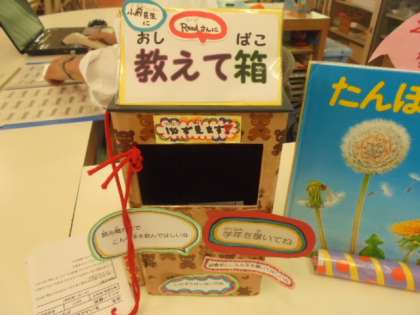 今日は、学校図書館補助員の小前先生が来られる日です。(上)折り紙であじさいの花を折ってみましょう。(中)新しい本の紹介です。(下)リードさんの皆さんが作ってくださった「教えて箱」です。いつもありがとうございます。