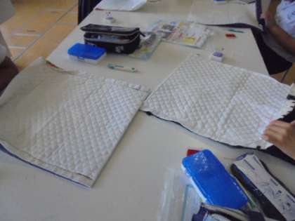 家庭科のナップサック作りが進んでいます。「見て〜」と子どもたち。