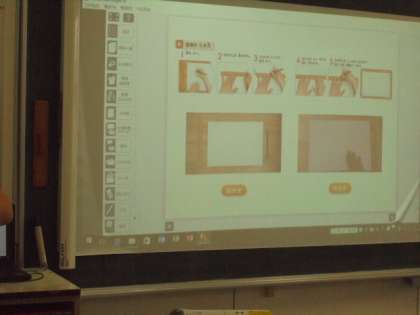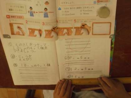 算数で、長さの勉強をしています。デジタル教科書を活用して、わかりやすく説明しています。