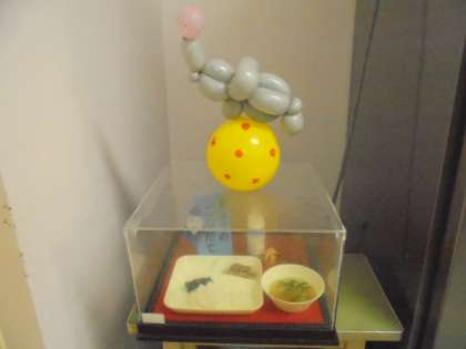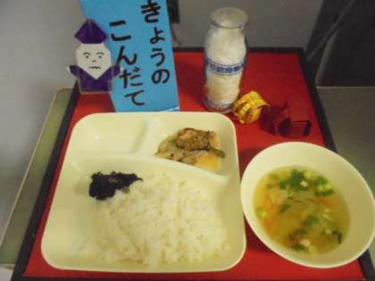 今日の献立は、豚肉のごまみそ焼き、すまし汁、のりのつくだ煮、ごはん、牛乳です。給食調理員さんが作ってくださった「サーカスの象」に、子どもたちは大喜びです!
