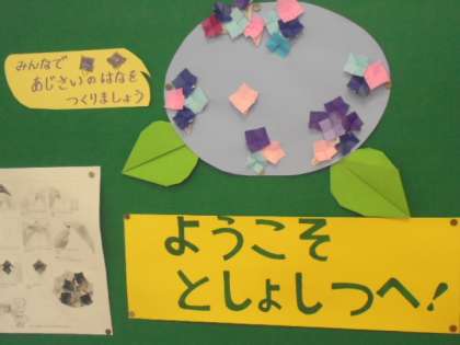今日は、図書館補助員の小前先生が来られています。図書室の中に、季節にあったいろいろな本を紹介してくださっています。あじさいの花を折って、あじさいの花をつくりましょう!