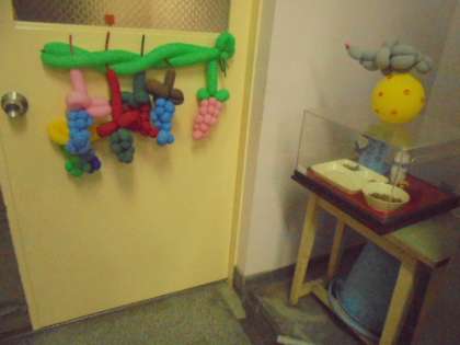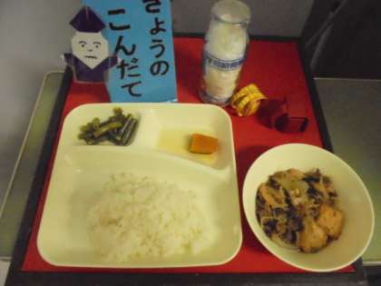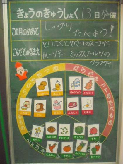 今日の献立は、すき焼き煮(ふ)、三度豆のごま酢あえ、焼きかぼちゃの甘みつかけ、ごはん、牛乳です。バルーンアートに、ぶどうが登場です!